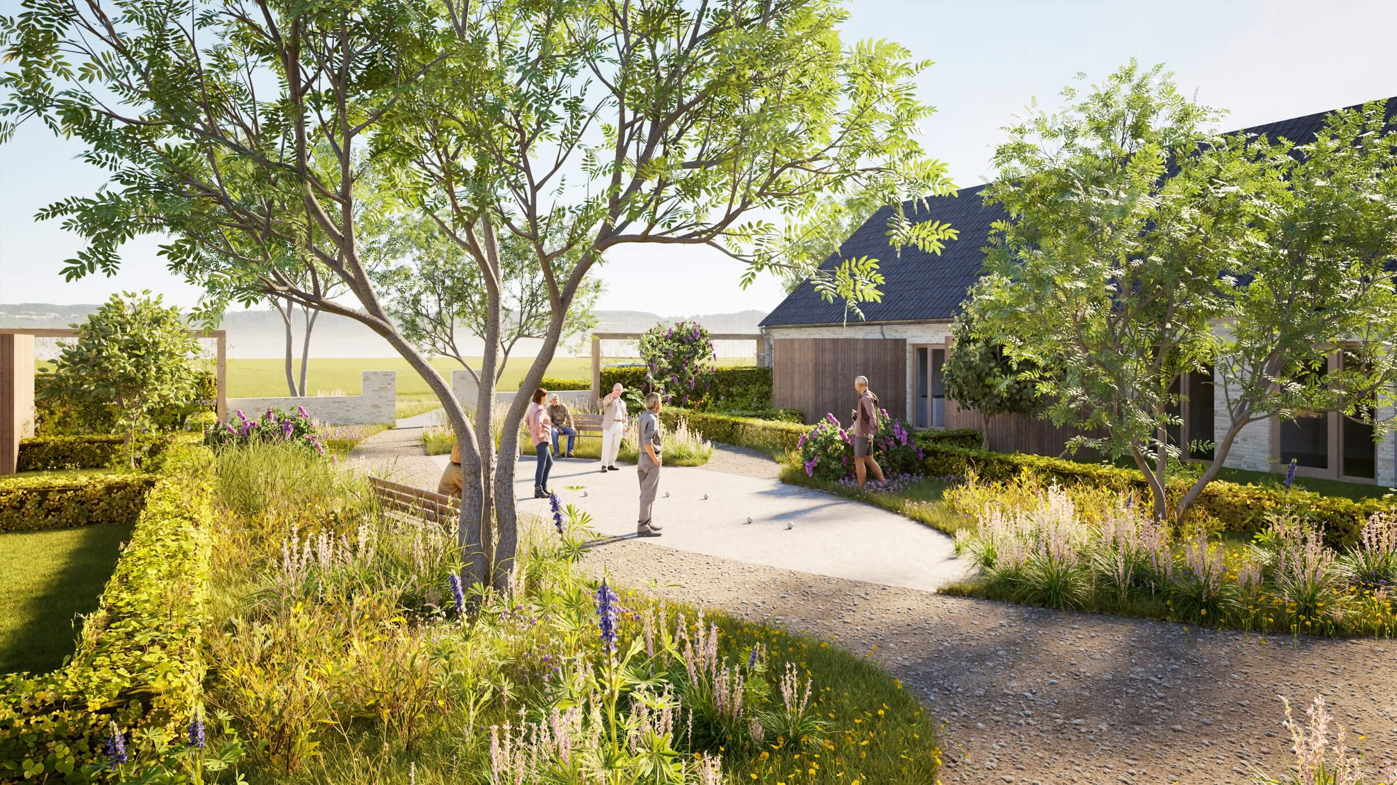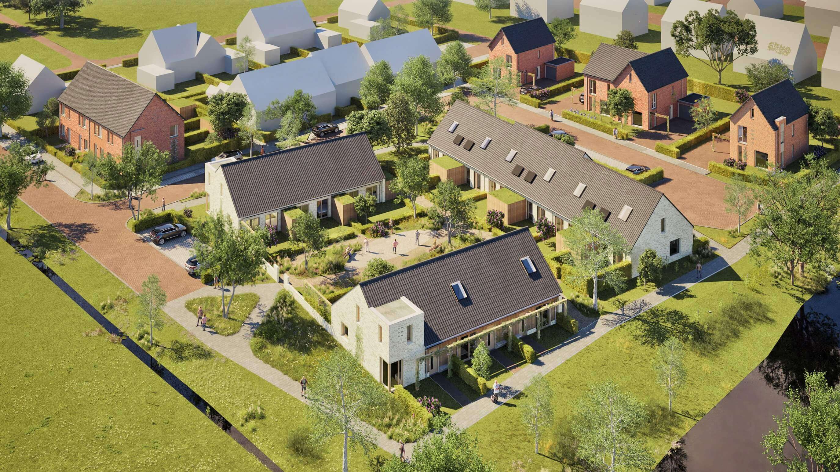 In het nieuwe woongebied staat spelen, ontmoeten en groen centraal. Onverharde paden doorkruisen het plan en sluiten direct aan op het omliggende landschap.
